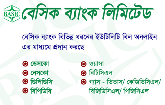 BASIC Bank PLC. launched Real Time Utility Bill Payment System on May 8, 2014. At present, customers of Dhaka WASA, BTCL, DPDC, DESCO, TITAS and KGDCL can pay their utility bills on real time basis from any branch of BASIC Bank across the country.